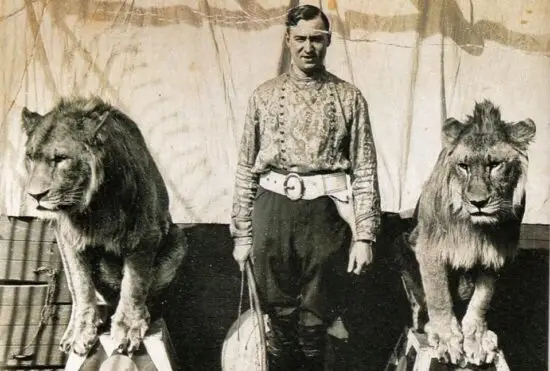 foto boven: Carlo Stevens tussen zijn leeuwen (foto collectie heemkundekring Helmont)